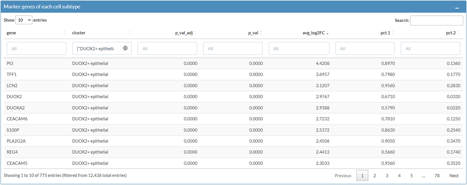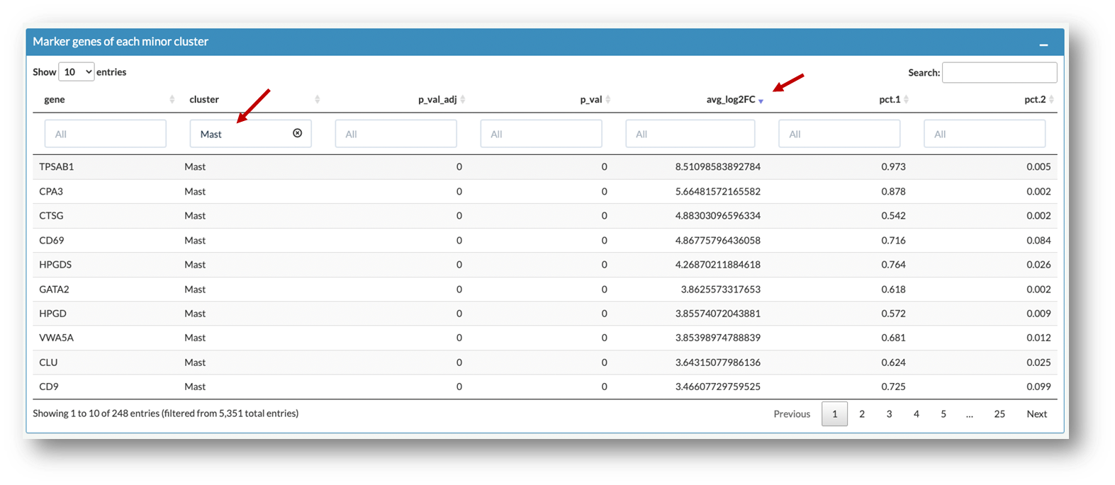 After choosing Mast cell and ranking the list according to avg_log2FC, differential expressed genes are listed. User can explore and compare their expression profiles in the Gene Expression Profile tab and the Gene Expression Comparison tab.
