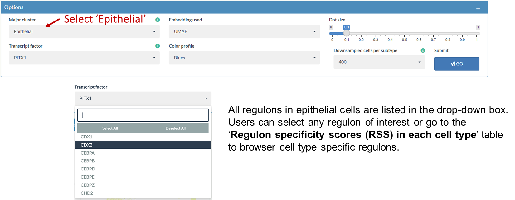 Compared to the control panel of the first two parts, several additional choices are provided for Gene Expression Comparison part, including Tissue, Developmental stage, Study, Minor cluster, Location, Disease state and Sample.