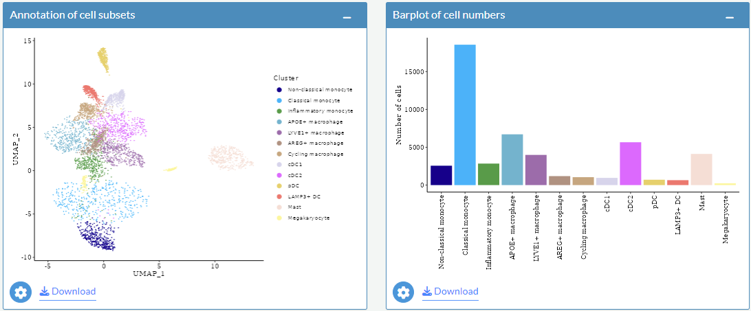 After selecting Myeloid as major cluster, annotations of cell subsets (left) and number of cells (right) in myeloid compartment will be shown. The calculation of the cell numbers is based on the whole data set not the down sampled data set.