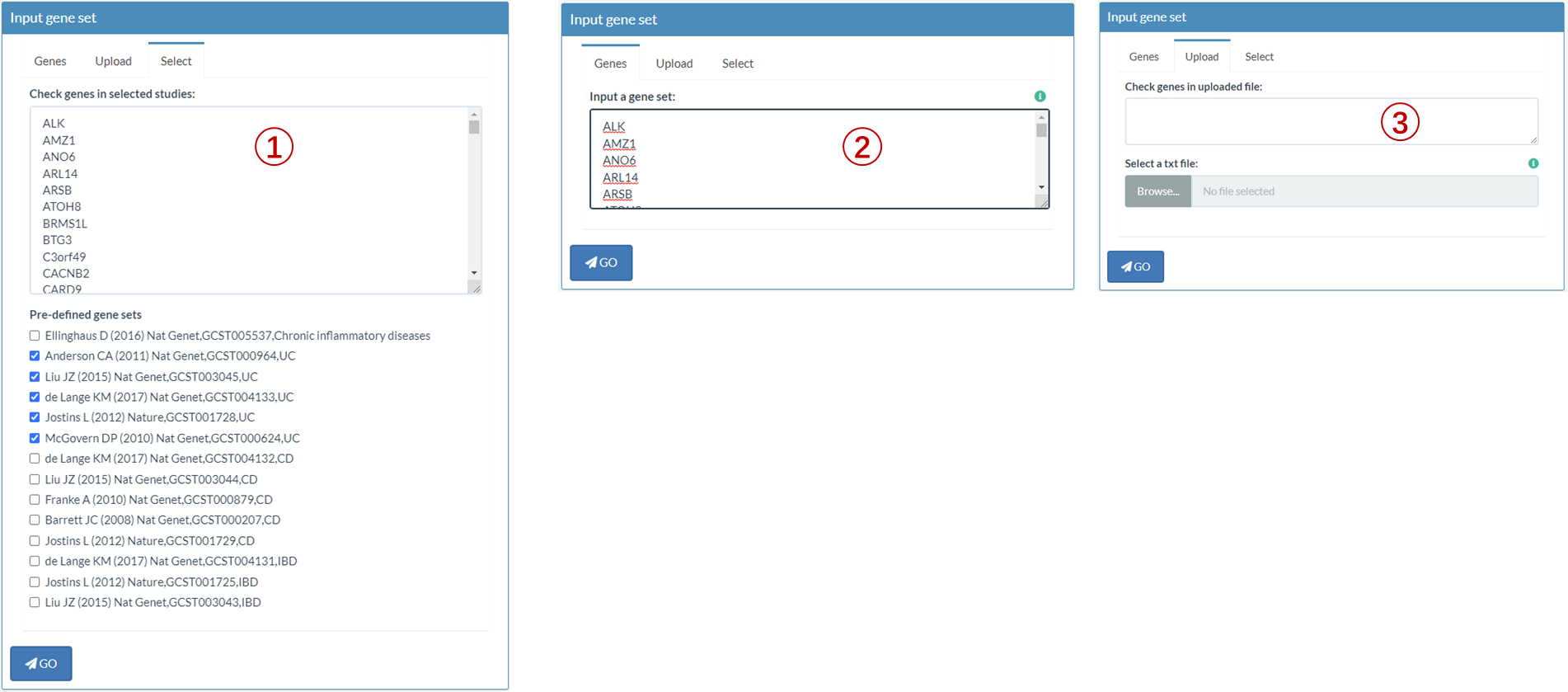 Similarly, you can define your interested gene set (2) in the same format (one gene per line) or upload a txt file (3) containing your gene set.