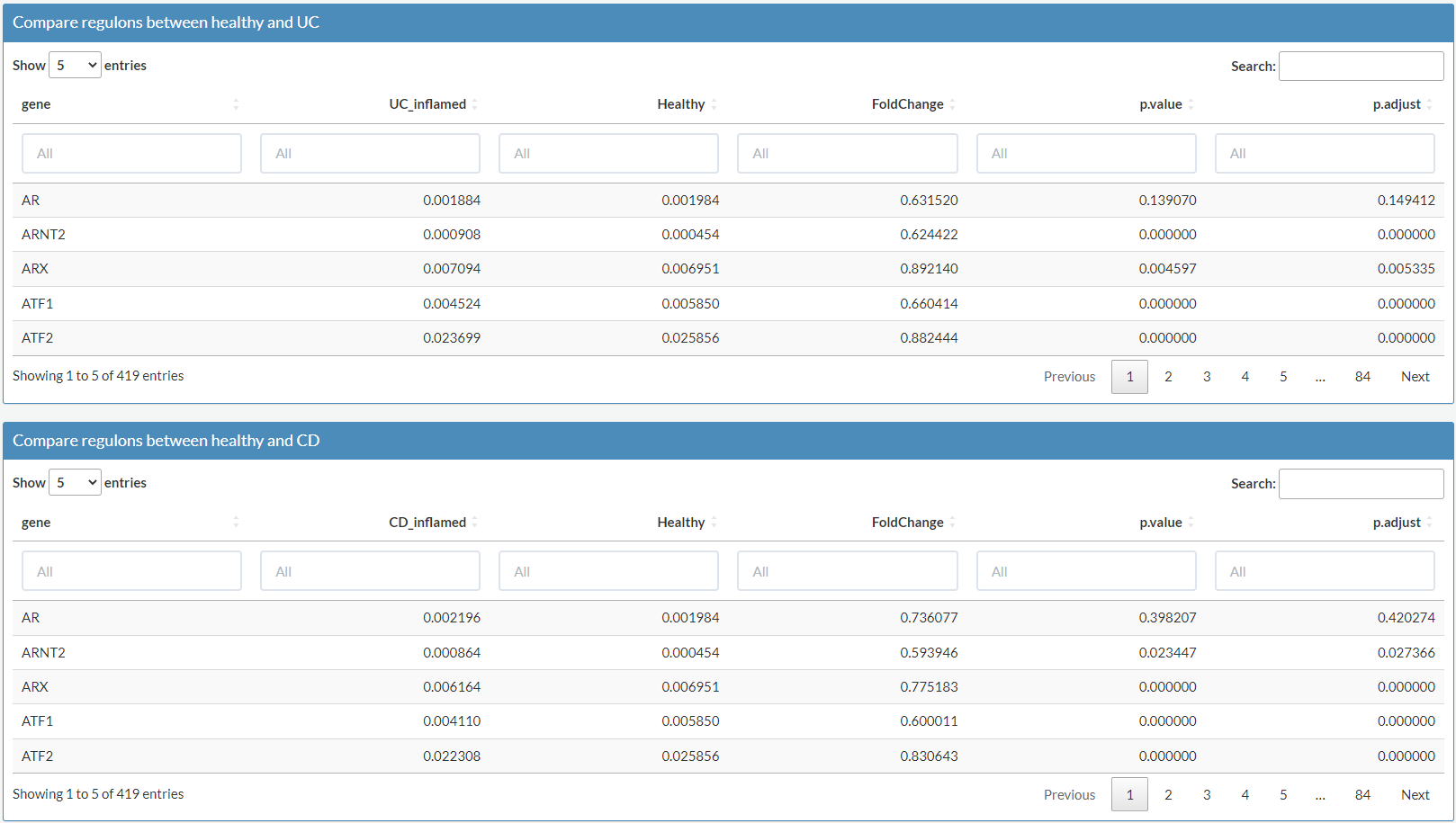 In the box of Compare regulons between healthy and CD (UC), the value in the second and the third column represents the average regulon activity in inflamed tissue of CD, UC patients or healthy individuals.