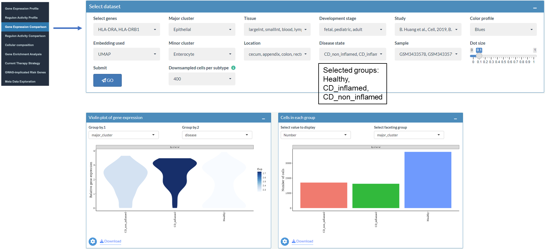 With scIBD, users are convenient to explore signature genes of each cell subtype, and compare gene expression of given genes (such as therapy targets, cytokines, IBD-GWAS related genes, or others) between health and disease across major clusters or cell subtypes.