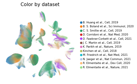 Batch correction of datasets from multiple studies which covered three developmental stages and multiple disease conditions, was performed with bbknn (v1.5.1, bath_key="sampleName", neighbors_within_batch=3, metric="euclidean", n_pcs =30).